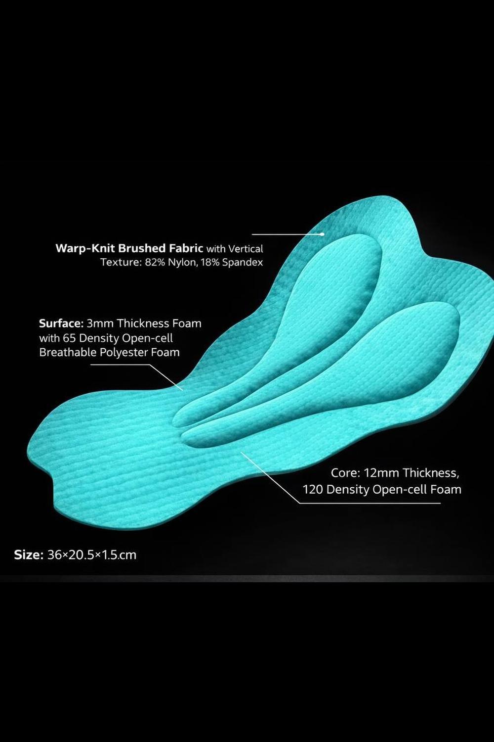 🔹 Performance Pad: High-density, multi-layer chamois engineered for long-distance comfort — up to 4 hours in the saddle. Featuring a 12mm core with 120-density foam and a 3mm breathable top layer, it delivers targeted support, excellent moisture management, and long-lasting resilience.